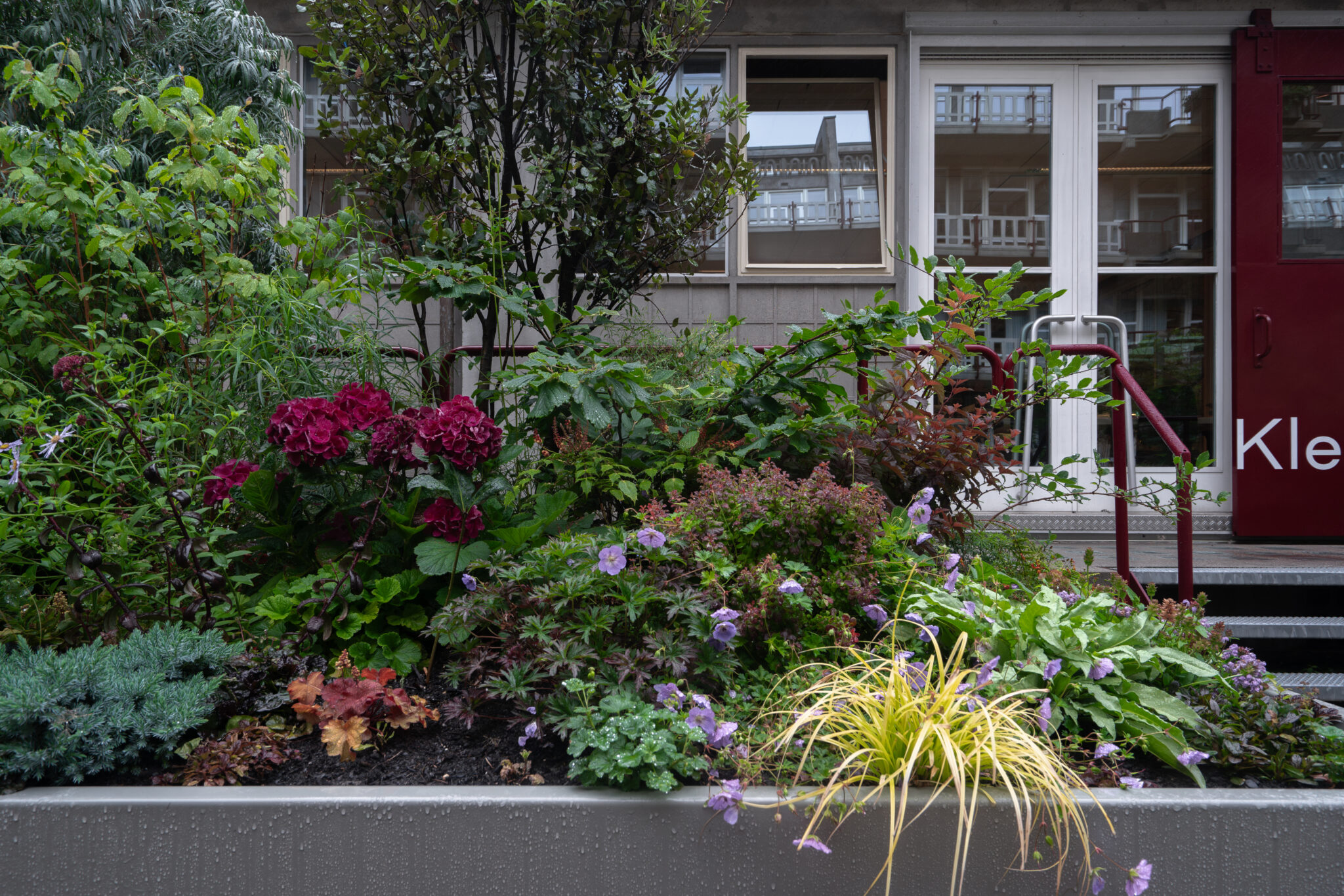 Om het gebouw volledig te eren, zijn we samen met groenvormgever Harry Pierik in de ideeën van architecten Maaskant en Van Tijen gedoken. De beplanting sluit in kleur en vorm aan op de architecturale keuzes, de afmetingen van de bakken en borders volgen het ritme van het gebouw. De subtiele grijstonen in het loof – zoals eucalyptus, wilg en duindoorn – harmoniëren prachtig met het beton van het gebouw. We hebben meer dan 450 verschillende plantensoorten gebruikt, wat een rijk gedetailleerd beeld oplevert en de voorwaarden schept voor een rijke en gezonde biodiversiteit—iets om het hele jaar door van te genieten. Het Maaskant Park ligt vlak naast het Centraal Station en trekt veel publiek.