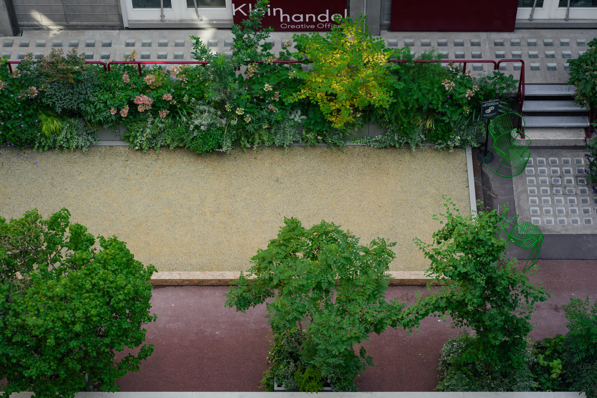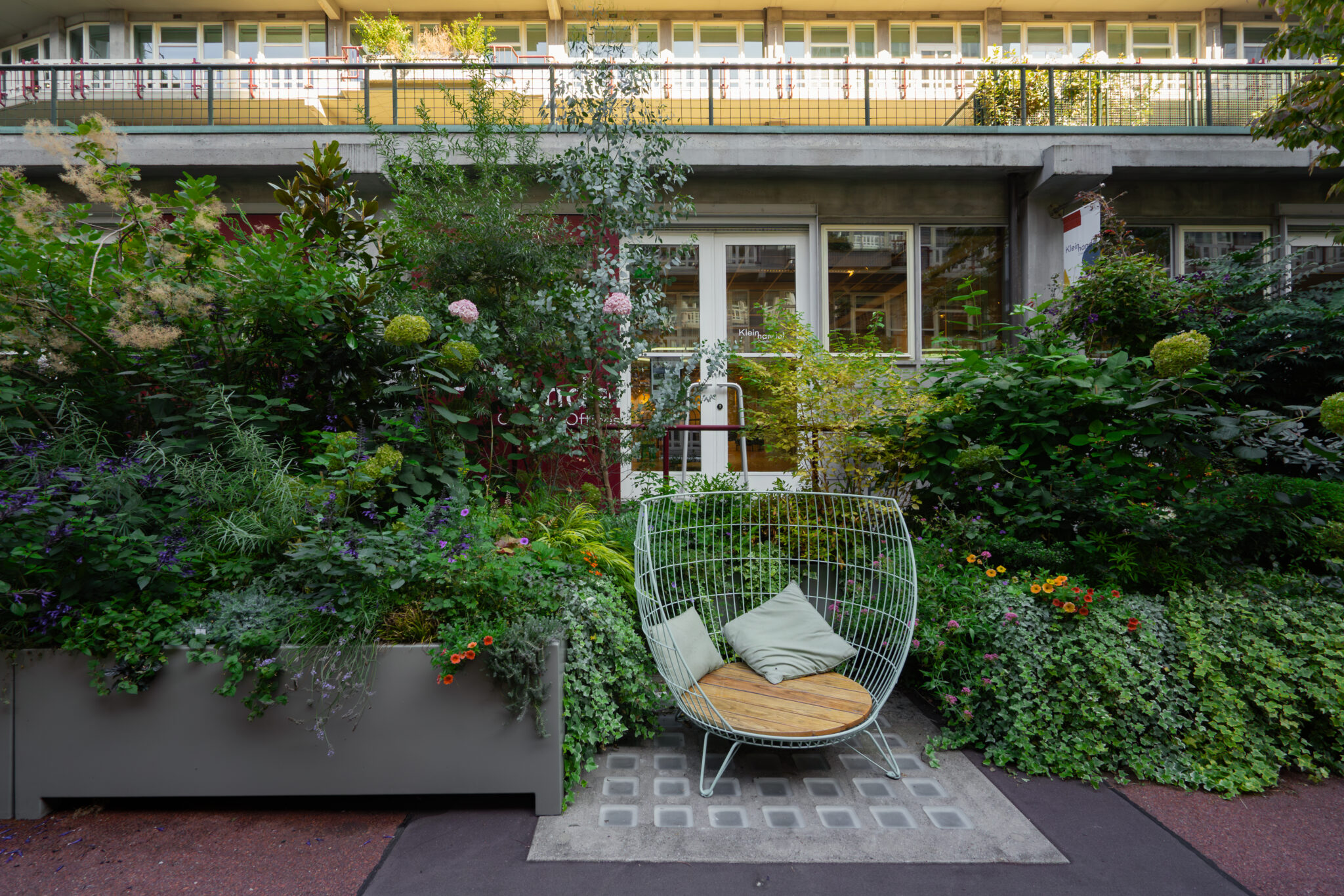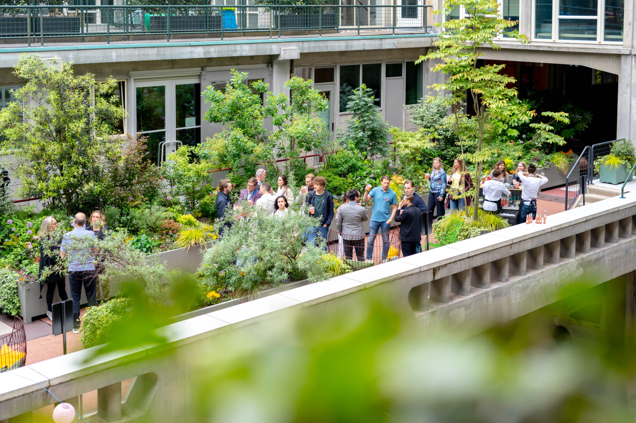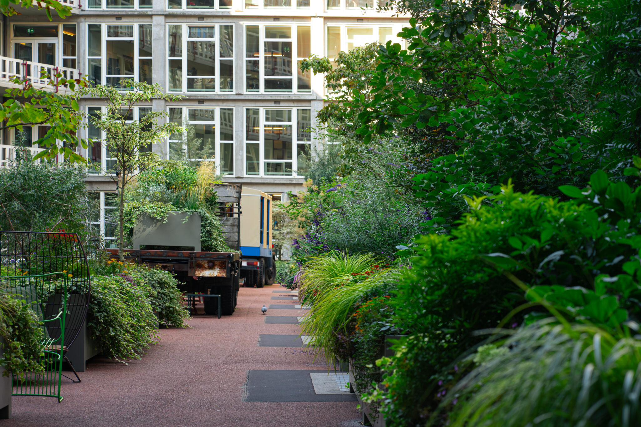 In onze filosofie staat de natuur voorop en de mens centraal: wij ontwerpen onze tuinen en parken om gebruikt te worden. Naast een petanquebaan hebben we verschillende stoelen en tafels geplaatst, waar gretig gebruik van wordt gemaakt. Zo wordt de tuin van het Groot Handelsgebouw niet alleen een fijne plek om te wandelen, maar ook om te werken en zelfs vergaderingen te houden. “Het voelt elke dag als kerst,” beschrijft een van de huurders het gevoel om hier rond te lopen en telkens iets nieuws te ontdekken. Daarnaast draagt al het groen bij aan meer zuurstof in de lucht, meer verkoeling in de zomer en minder wateroverlast bij hevige regenval. Het heeft dan ook een grote aantrekkingskracht op huurders. Want welk bedrijf zou hier nu niet willen zitten?