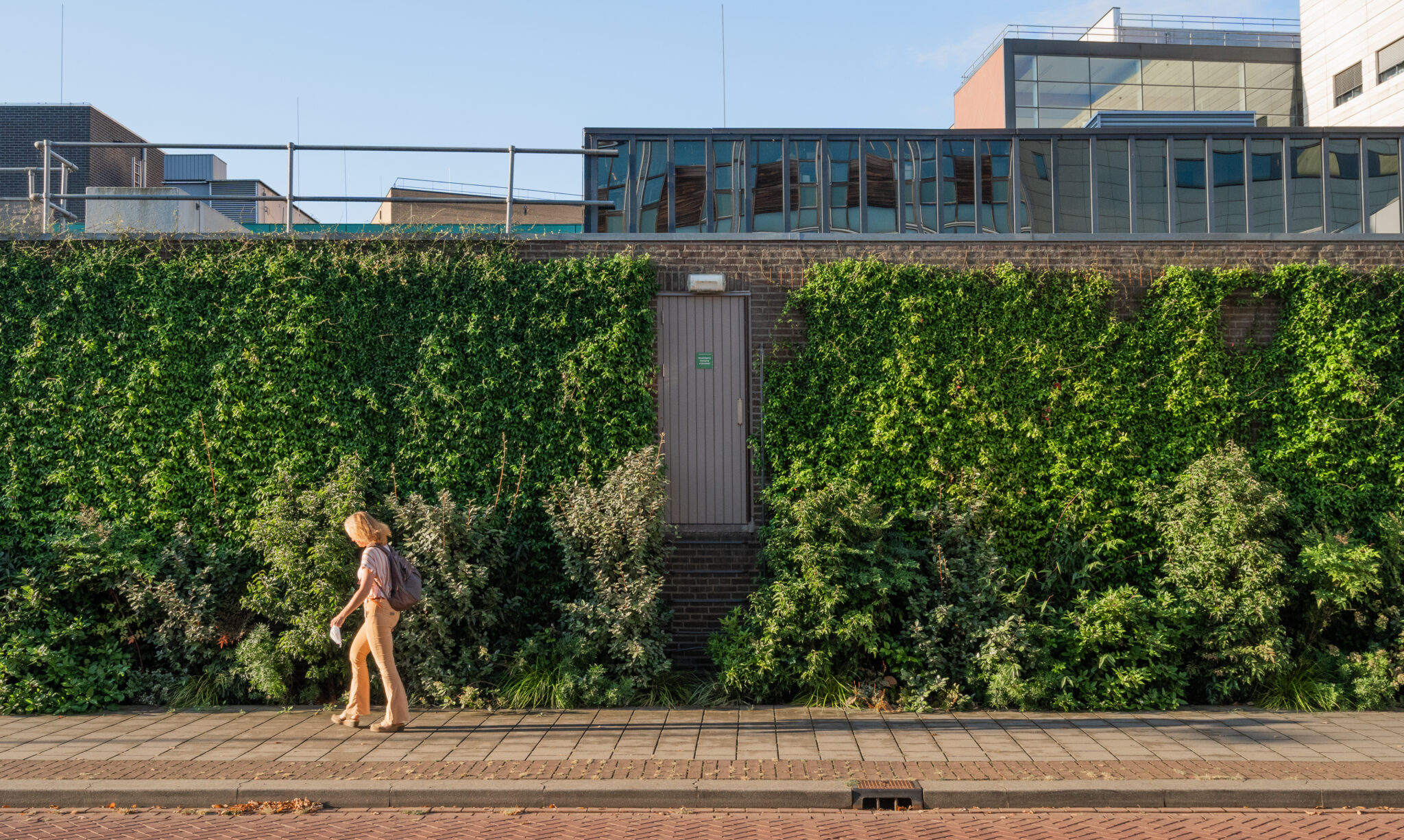 Een van de gedeeltes waar we met een relatief kleine ingreep een complete transformatie hebben kunnen bewerkstelligen, is die van het mortuarium. Waarvanuit je tegen een glazen wand aankijkt met daarachter een stenen plein. Niet bepaald een opbeurend uitzicht. Een mortuarium is al geen vrolijke plek, dat hoef je niet nog eens te benadrukken in een levenloze omgeving. Met een relatief kleine ingreep hebben we dit aanzienlijk kunnen verbeteren: op het dak plaatsten we afhangende beplanting, op de grond opgaande beplanting, zodat de twee naar elkaar toegroeien. Met een paar vierkante meter beplanting hebben we een wereld van verschil kunnen maken.